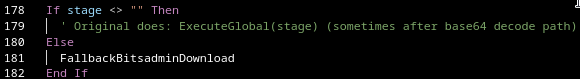 If no payload stage can be retrieved via the usual mechanisms, the script switches to downloading the payload using bitsadmin.