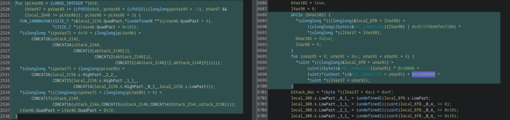 The call chain shows that the generated randomness directly feeds into subsequent runtime decoding routines, where multiple obfuscated data blocks are reconstructed through XOR-based transformations and dynamic key. In earlier versions, these decode paths relied almost entirely on static constants and predictable transformations.