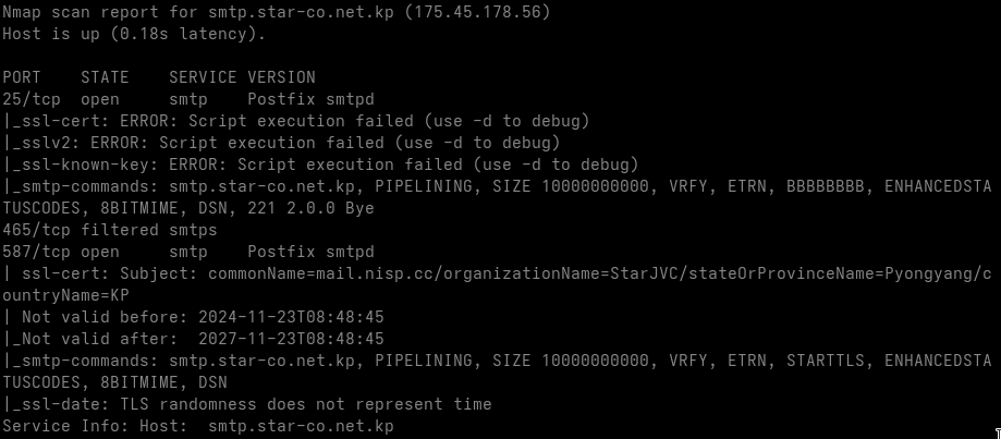 | mail.star-co.net.kp | 175.45.178.55 | Postfix | |