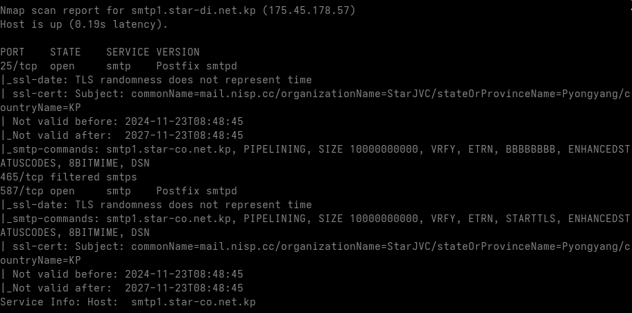 Subject: C=KP, ST=Pyongyang, L=Junggu, O=StarJVC, OU=DevelopTeam, CN=mail.nisp.cc, emailAddress=postmaster@star-co.net.kp